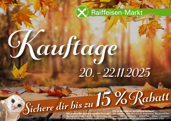 *15% Rabatt auf alle Artikel aus dem Raiffeisen-Sortiment - Nur Lagerware. Gültig 20.11.-22.11.25. Ausgenommen sind Aktionsartikel, Tabak- und Schreibwaren, Zeitschrifte, Bücher, Gutscheine, landwirtschaftliche Sackwaren und sonstige preisgebundene Artikel.